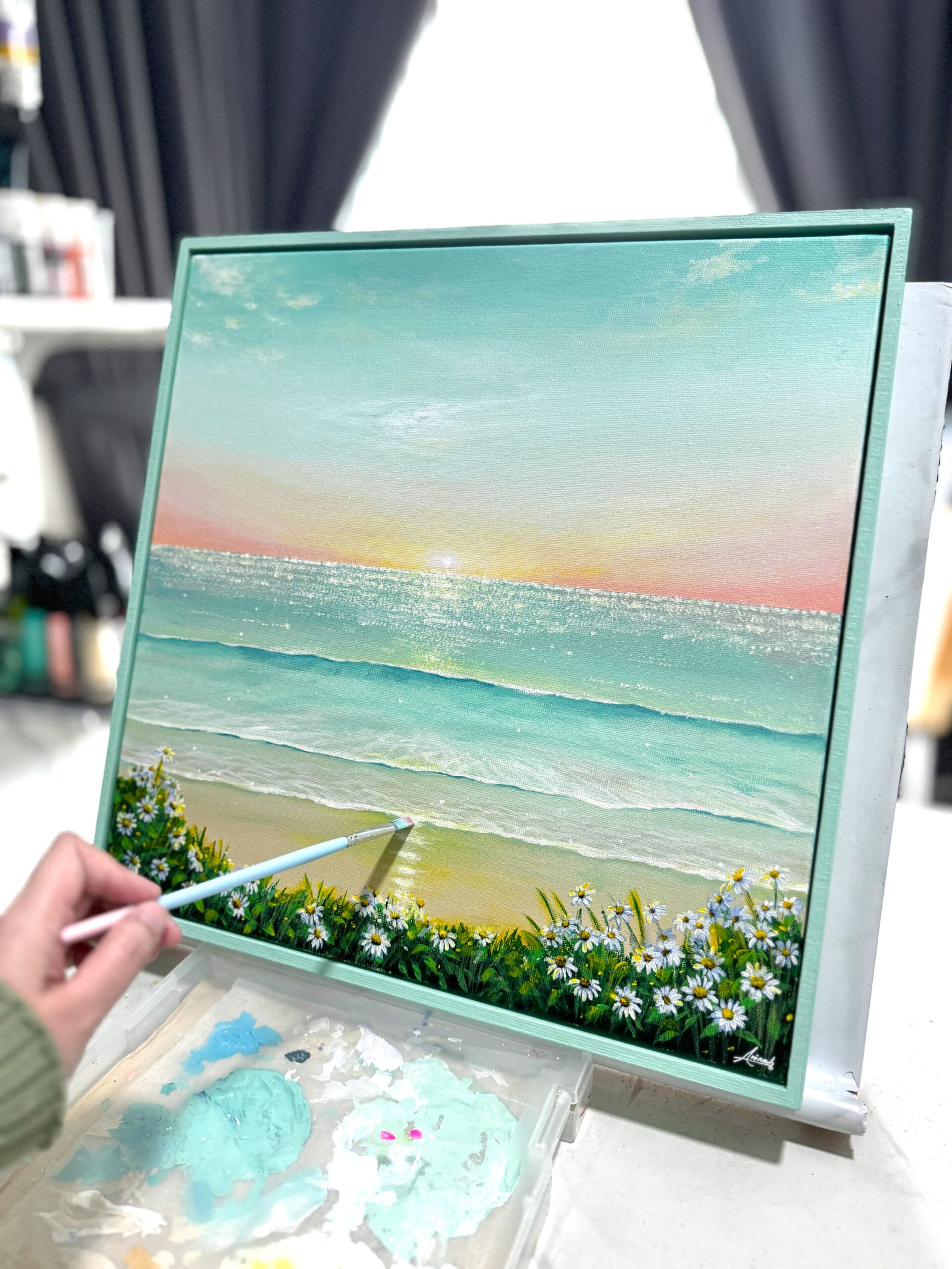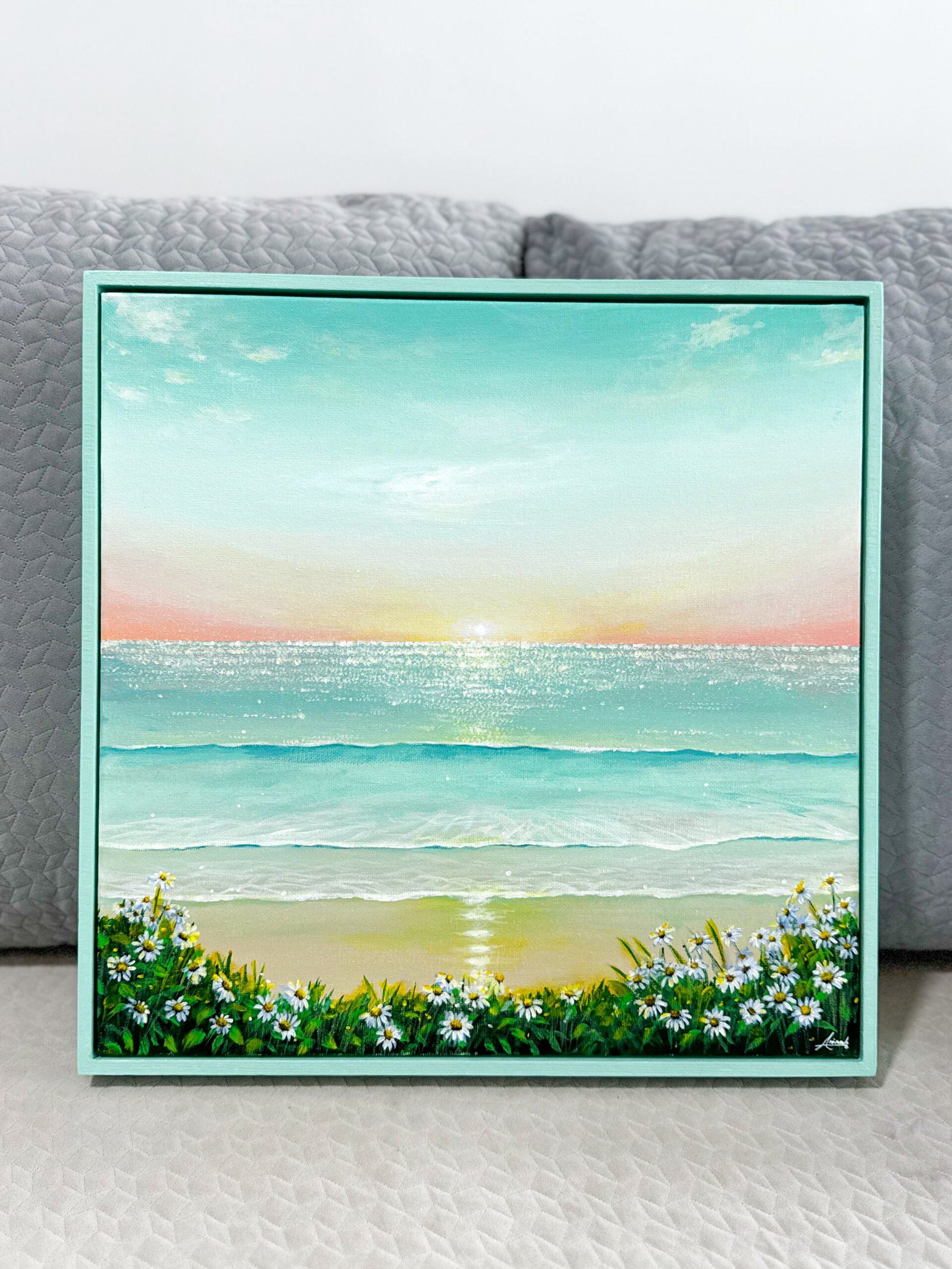 “Warmth of Twilight” is the last painting in Gentle Horizon series. Through Gentle Horizon, For this last piece, I chose teal as the main theme, it took me a while to find the right shade, blending several colors to create this calm, soothing hue. I hope this piece brings you a sense of peace